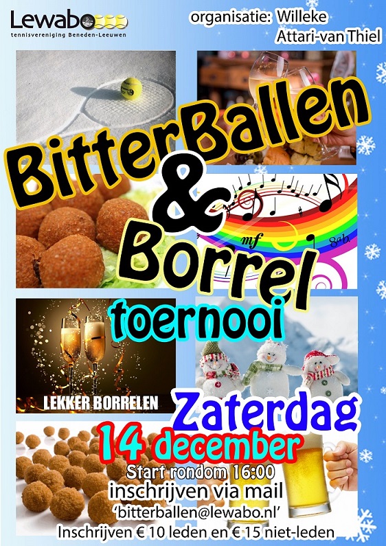 14 December wederom een gezellig tennis toernooi voor de senioren. Lid of geen lid, allen welkom. Er worden zeker bitterballen geserveerd en borreltjes opgegooid...