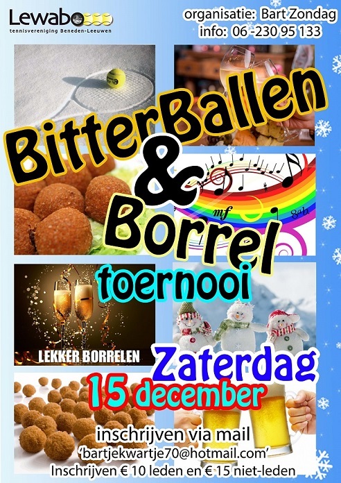 Het Bitterballen & Borrel Toernooi wordt ook dit jaar weer in de koude maanden georganiseerd. Datum voor dit jaar = 15 december 2018.