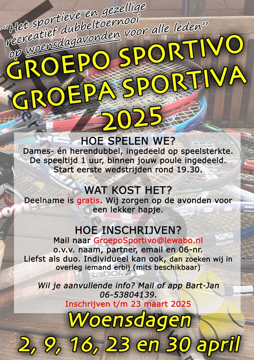Een gezellig dubbel toernooi voor Lewabo leden op alle woensdag avonden in april 2025 bij Lewabo. Check de poster en geef je op als je mee wilt doen. Aanmelden kan tot 23 maart a.s..