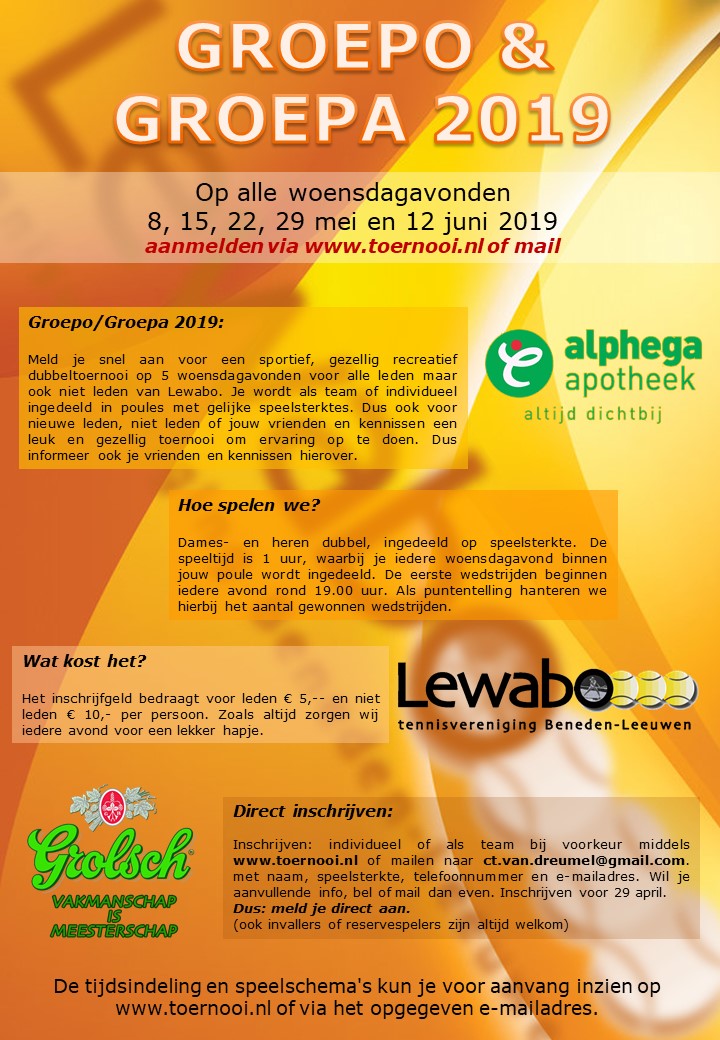 Een sportief, gezellig recreatief dubbeltoernooi op 5 woensdagavonden voor alle leden van Lewabo maar óók voor niet-leden.