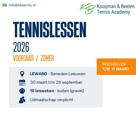 Ook deze zomer worden de lessen bij Lewabo weer verzorgd door Kooijman & Beelen Tennis Academy.