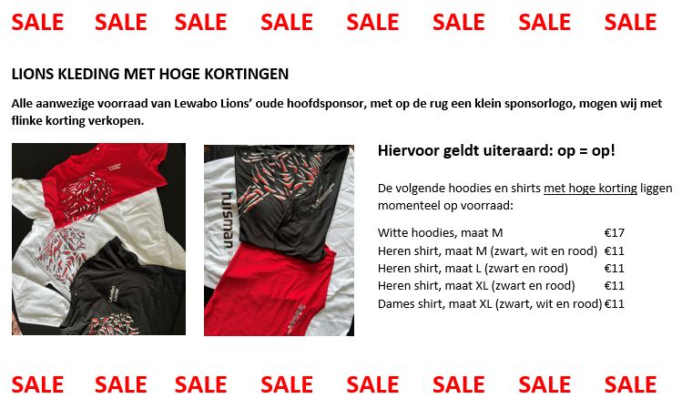 - Daarnaast hebben we nog een voorraad kleding met Lewabo Lions’ oude hoofdsponsor, met op de rug een klein sponsorlogo. Deze mogen wij nu met flinke korting verkopen = SALE