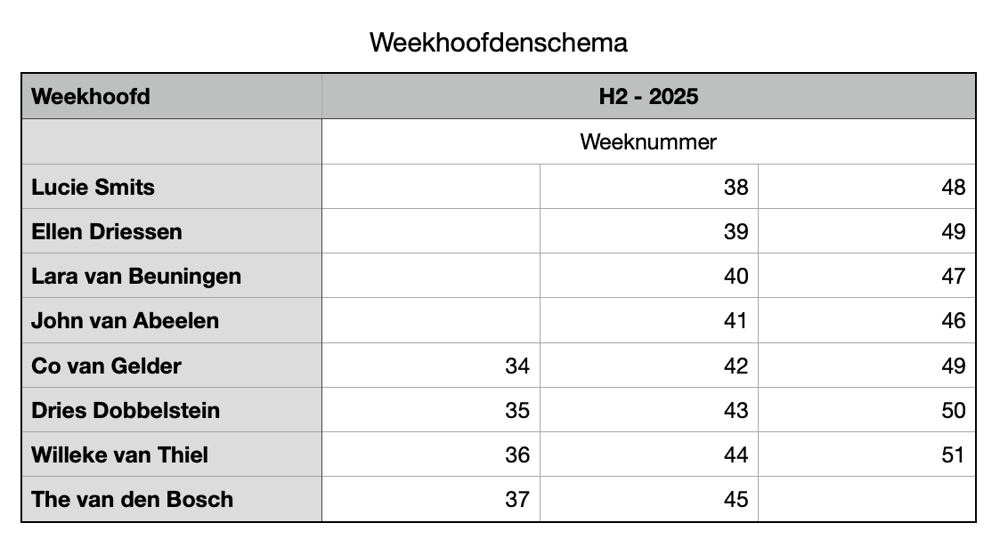 Hieronder zie je de planning (weeknummers) van de bardienst-weekhoofden: